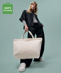 Tote. Zip closure. Internal pouch. Flat base. Durable webbing handle. Antique brass zip pull with cotton tab. Certified 340gsm organic cotton.